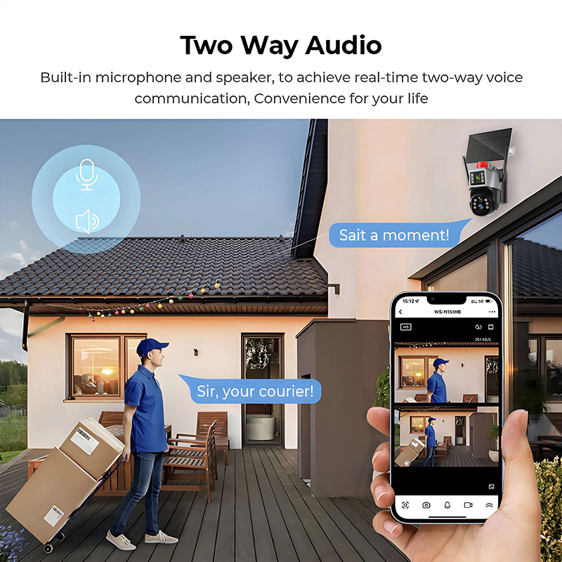- Audio bidirecțional: microfon + difuzor integrate pentru dialog la distanță.