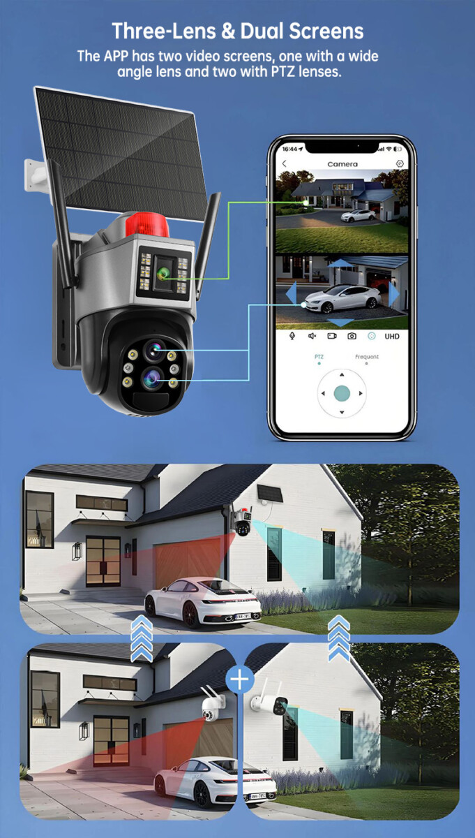 Cameră de supraveghere solară 4G ValVirtalex S6B-10X – soluția completă pentru siguranță fără cabluri. Cu zoom optic 10×, lentile 3MP+3MP+3MP, panou solar de 8W și baterie de 8000mAh, oferă autonomie extinsă și imagini clare zi și noapte. Conectivitate 4G prin cartelă SIM, viziune color și protecție IP65 pentru utilizare în exterior.