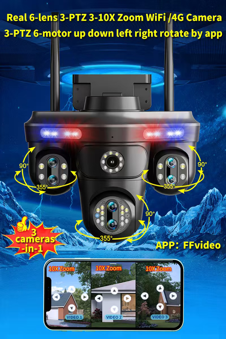 Cameră ValVirtalex® 4MP cu trei lentile independente, zoom optic 10X, WiFi + port LAN, autotracking şi vedere nocturnă color. Ideală pentru montaj exterior rapid şi monitorizare eficientă.