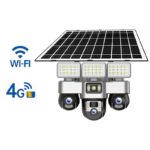 Cameră de supraveghere solară inteligentă V380 cu triplă cameră, conectivitate WiFi și 4G, panou solar integrat, iluminare LED, vedere nocturnă și control PTZ din aplicație. Ideală pentru curți, ferme, cabane, șantiere sau zone fără curent electric.
